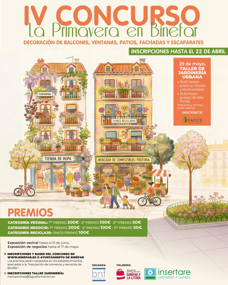El área de Medio Ambiente del Ayuntamiento convoca la cuarta edición del concurso ‘La primavera en Binéfar’ que pretende animar tanto a particulares como a empresarios a engalanar las fachadas, patios y balcones de sus viviendas o escaparates de sus establecimientos comerciales con macetas o adornos florales –siempre con flores naturales- para embellecer la ciudad.
